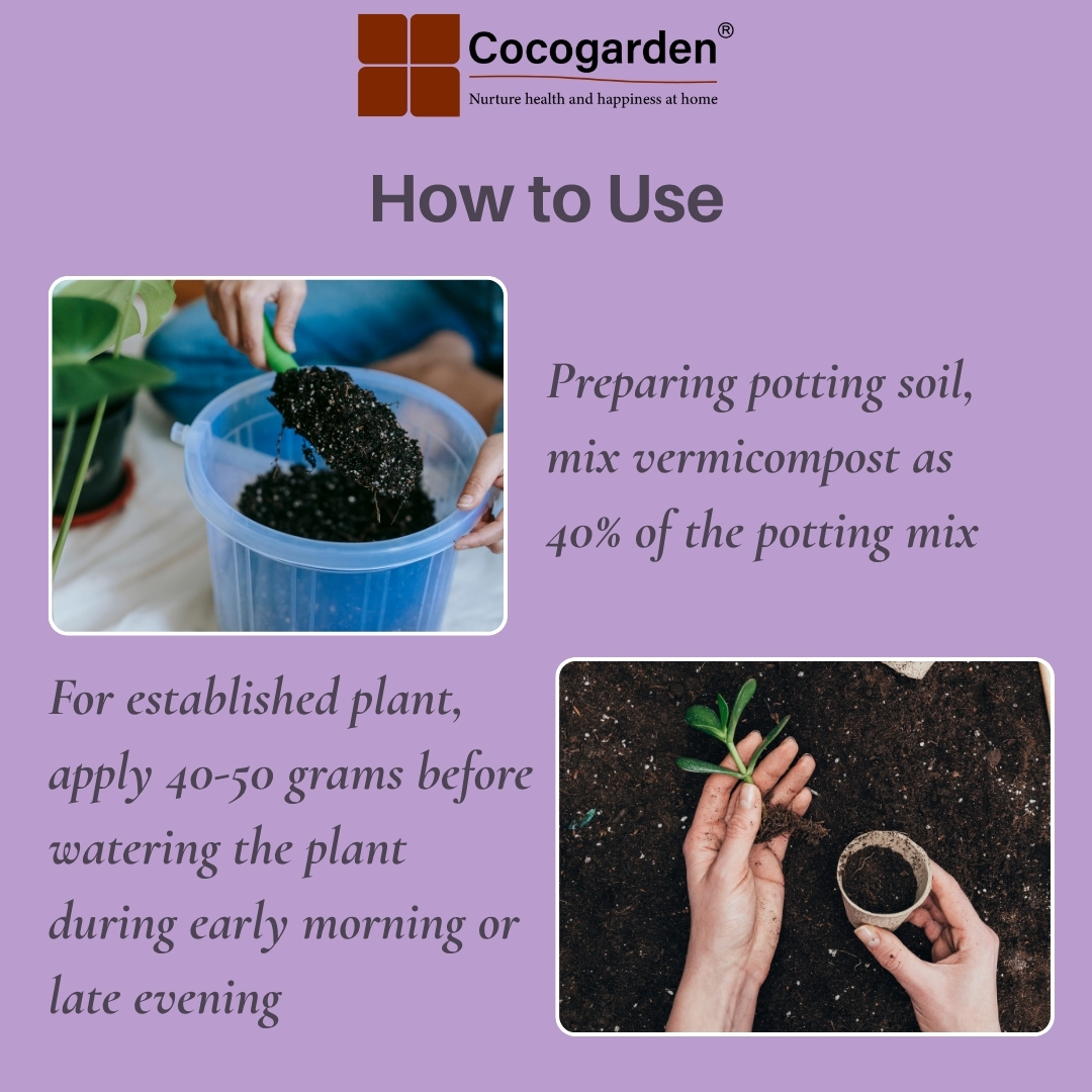 - How to apply : When preparing potting soil, mix vermicompost as 40% of the potting mix. For established plant, apply 40-50 grams before watering the plant during early morning or late evening.