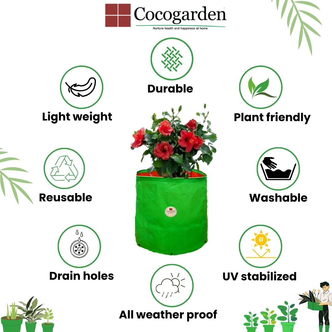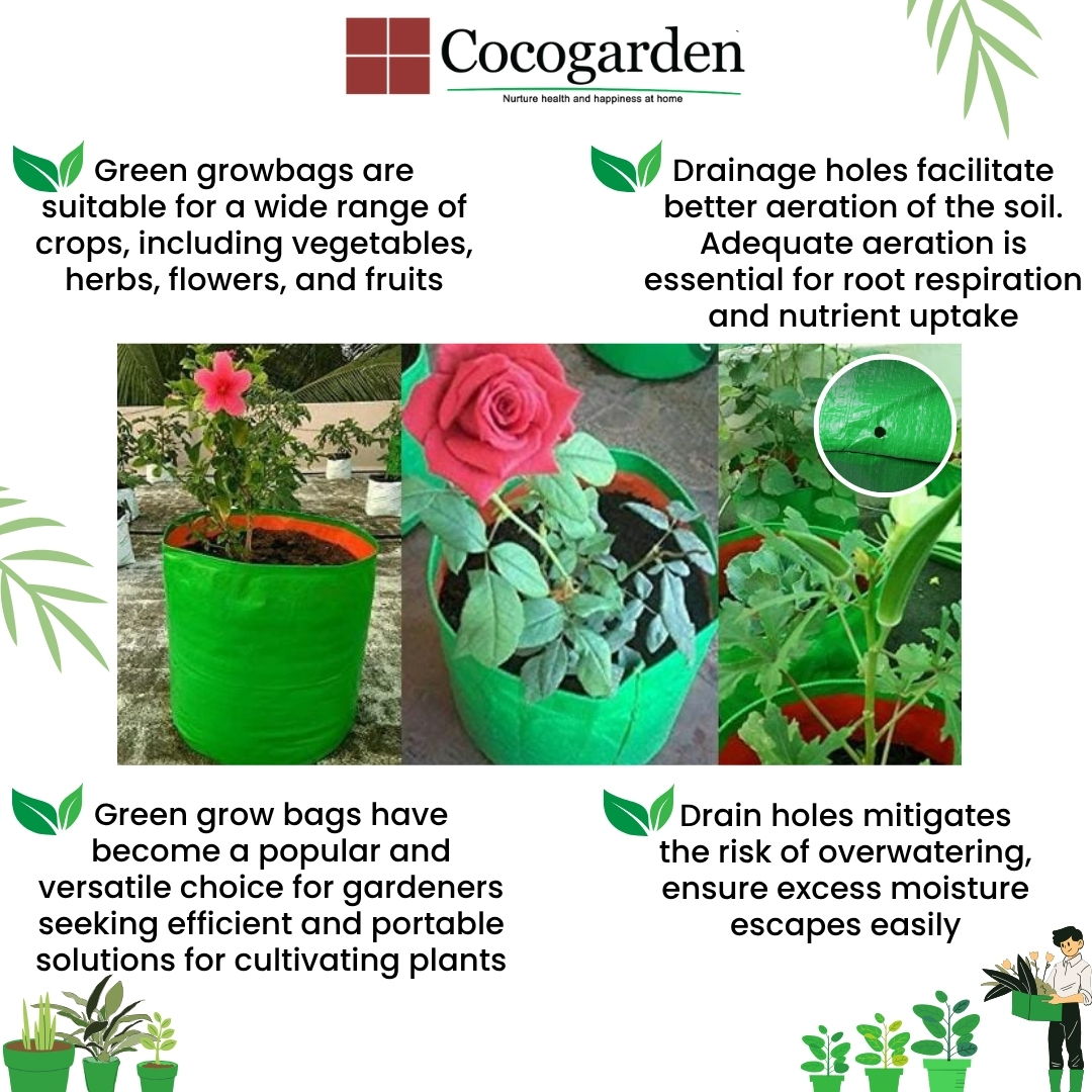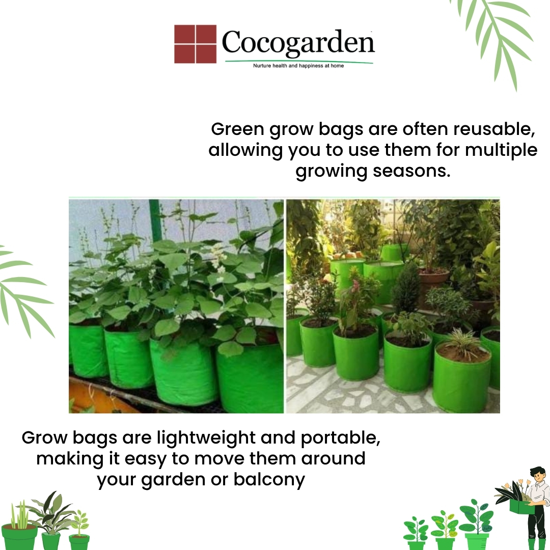 Cocogarden presents plastic hdpe grow bag which is green in color.Want to grow individual plants or small bunches of herbs in your Balcony or Terrace? Then this poly grow bags is the exact choice for you. You don’t even need a garden to grow with grow bags. Lay them along the windows or on the floor. This grow bags can be easily washed and reused. During the off season or when not in use grow bags can be folded up and stored and it is required minimal space. Drainage holes allow excess water to escape through the bottom of a grow bag. This goes especially for people who are either building or growing a container garden