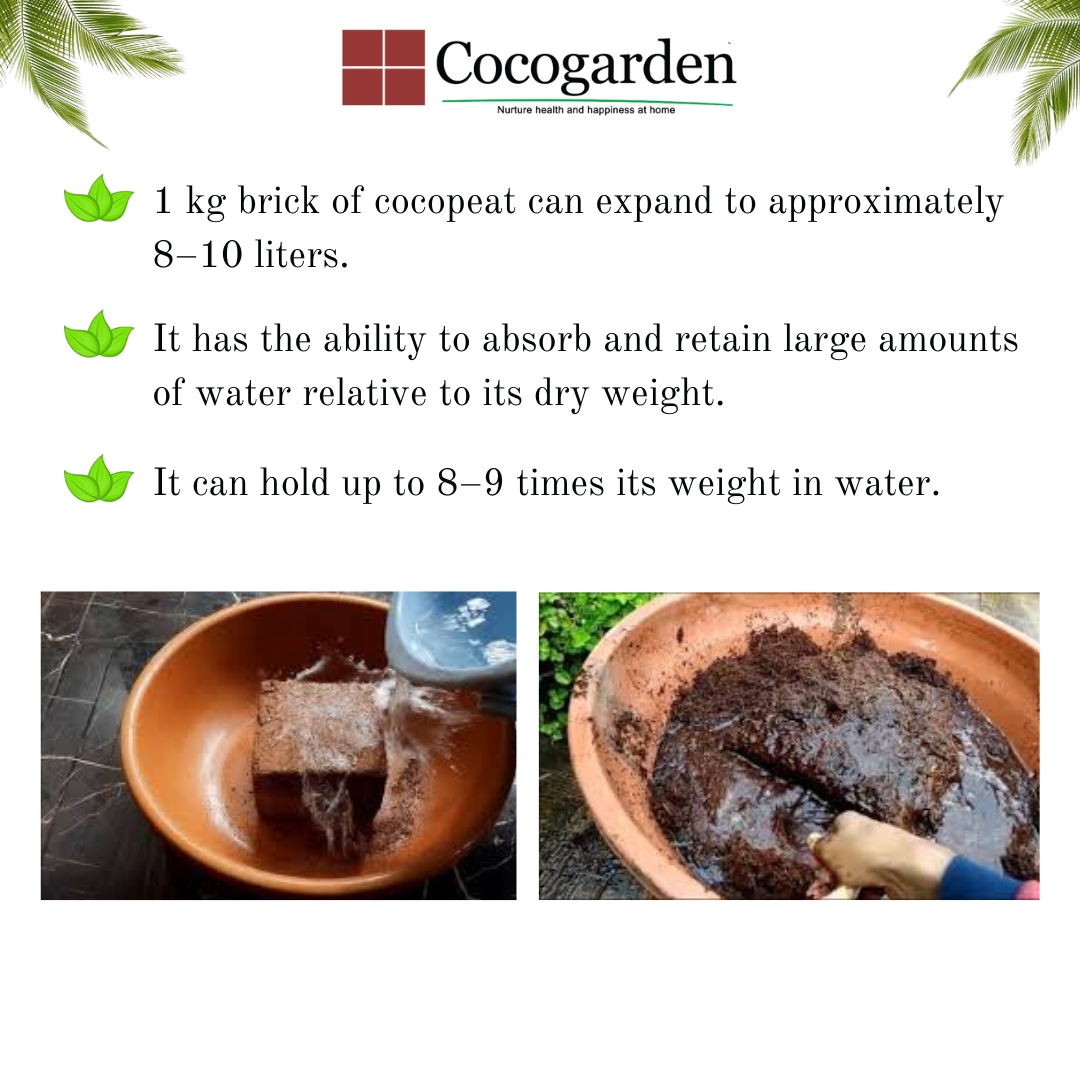 • Water-Holding Capacity: When a cocopeat brick is rehydrated, it expands significantly. A 1 kg brick of cocopeat can expand to approximately 8–10 liters. It has the ability to absorb and retain large amounts of water relative to its dry weight. It can hold up to 8–9 times its weight in water.