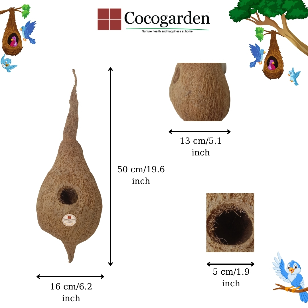 Coir fiber bird nests for sparrows and other small birds is a great way to support local wildlife and encourage these birds to make your garden or outdoor space their home. Coir fiber bird nests are decorative or functional items crafted from various natural fibers. They are designed to mimic the appearance and functionality of real bird nests. They can be decorated with seasonal items such as faux flowers, small ornaments, or lights. They can be hung from trees or garden structures as part of garden decorations. Having a bird’s nest in your home or garden enriches the environment. It’s a simple yet powerful way to connect with nature and contribute positively to your surroundings.
